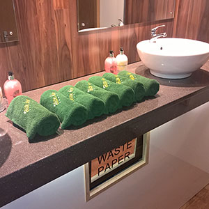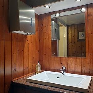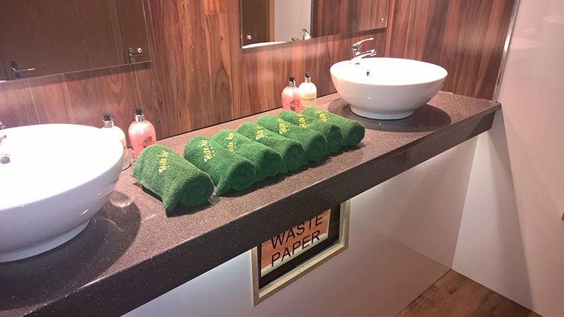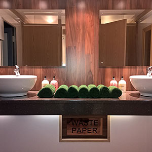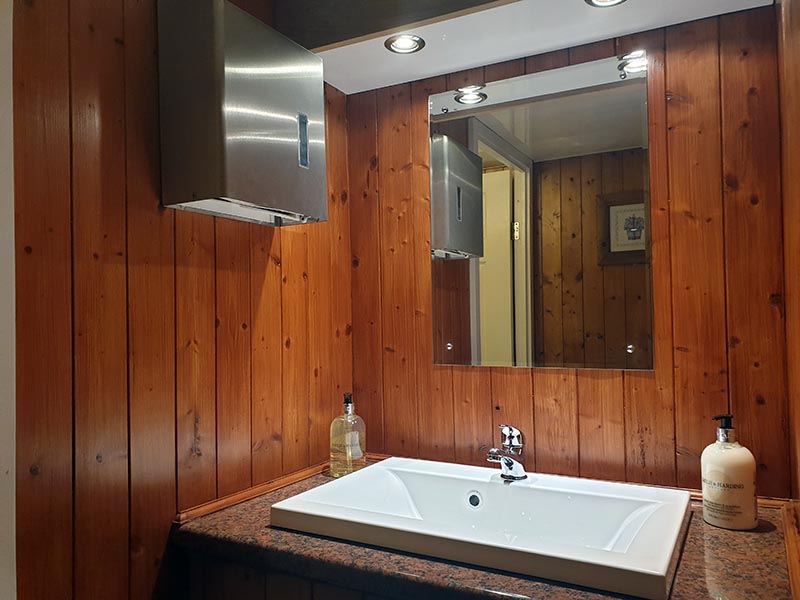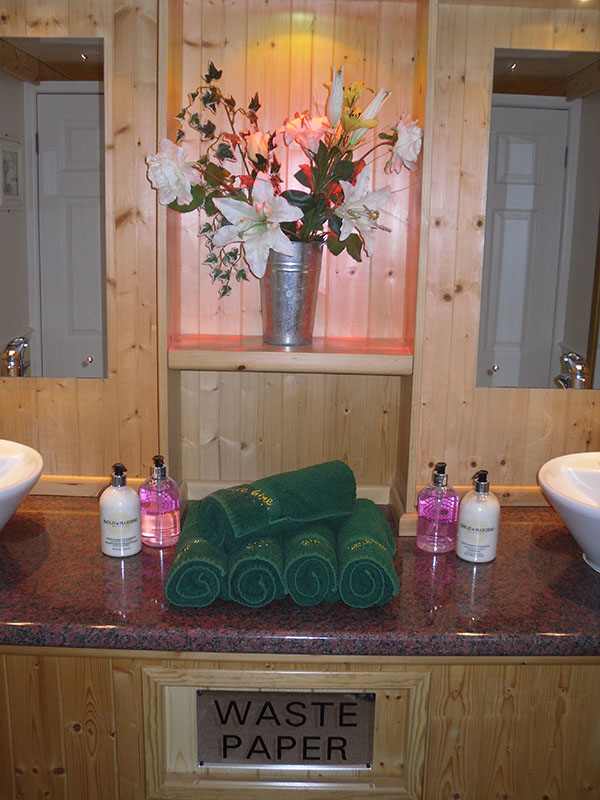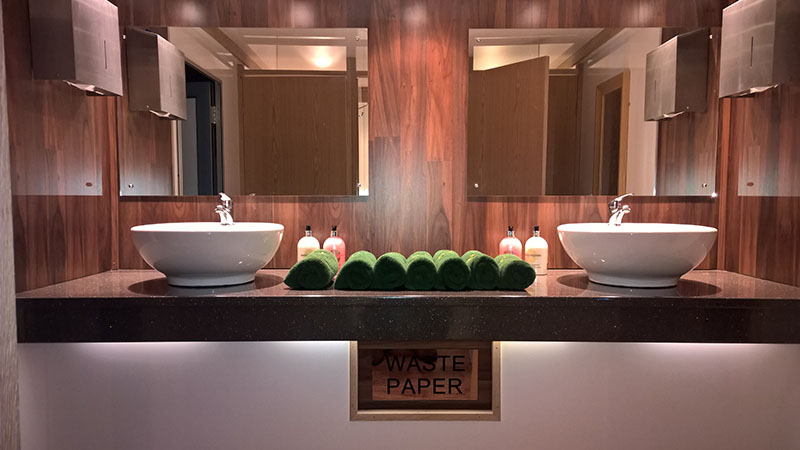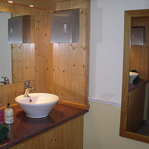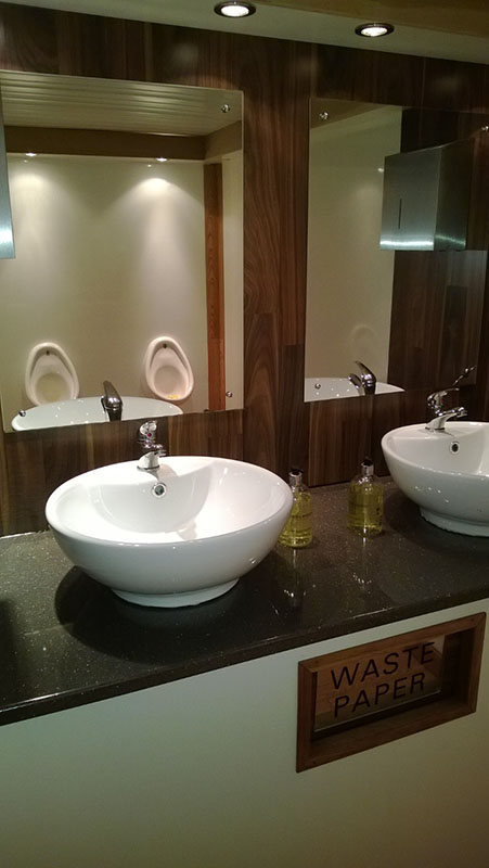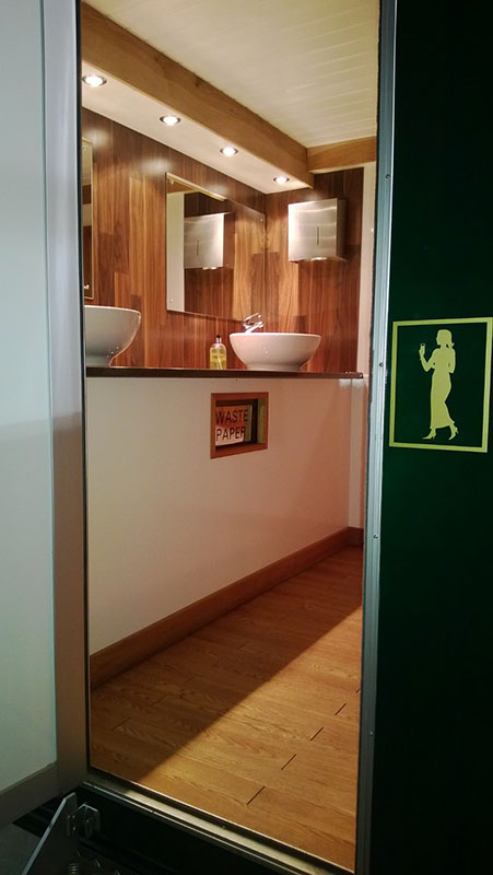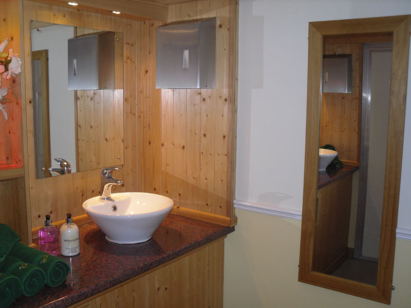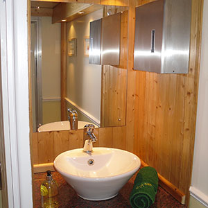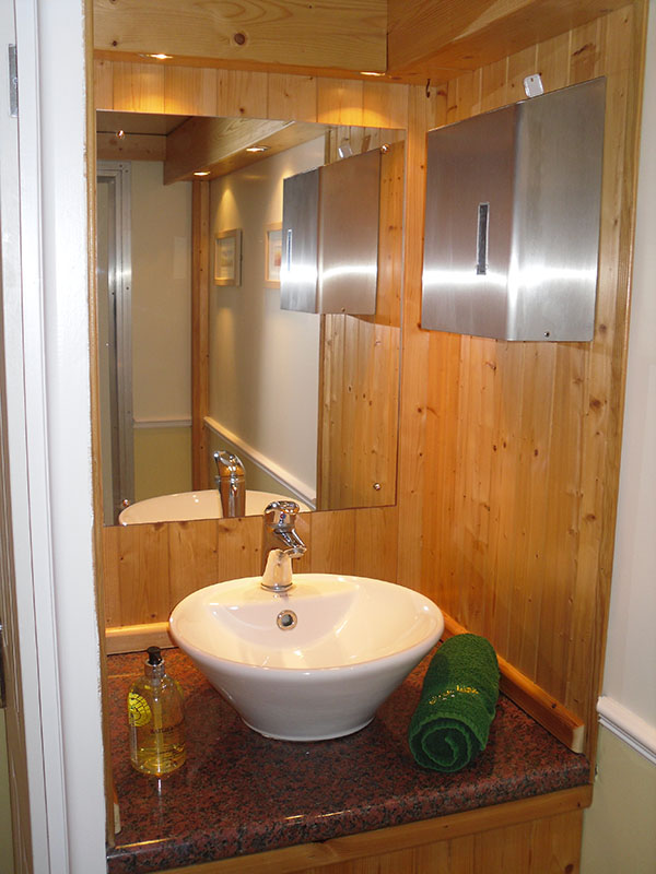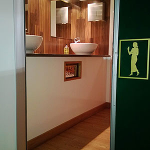 We use pastel colours and light woods along with gloss counter tops for the interiors. Mirrors lit with down-lights are fitted above the sinks and in addition there are full length up-lit mirrors in the ladies. Pictures, prints and silk flowers give the interiors a homely feel. We use brushed stainless steel as standard, whether it is for our hand towel and toilet tissue dispensers or for general waste bins. We use chrome as standard for our sink taps, door handles and locks. Included in the unit we provide hand soaps, hand creams, paper hand and toilet tissues and soft hand towels. Our units have hot and cold running water for hand washing and fresh water flushing toilets.
